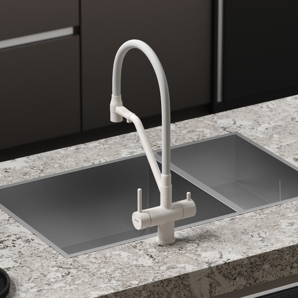 Смеситель для кухни Sancos Dora SC4003MW с гибким, поворотным изливом и подключением фильтра питьевой воды , материал - латунь, цвет - матовый белый/белый.