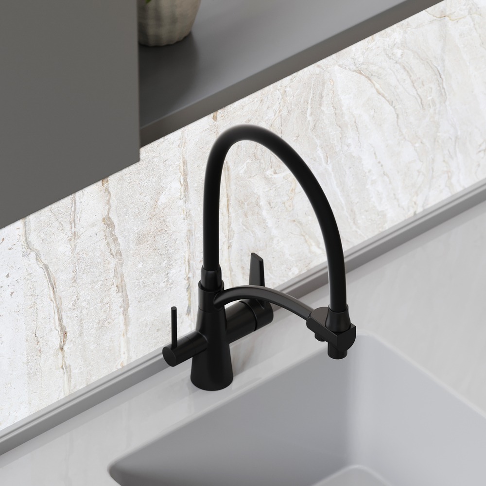 Смеситель для кухни Sancos Eri SC4001MB с гибким, поворотным изливом и подключением фильтра питьевой воды , материал - латунь, цвет - чёрный матовый/чёрный.