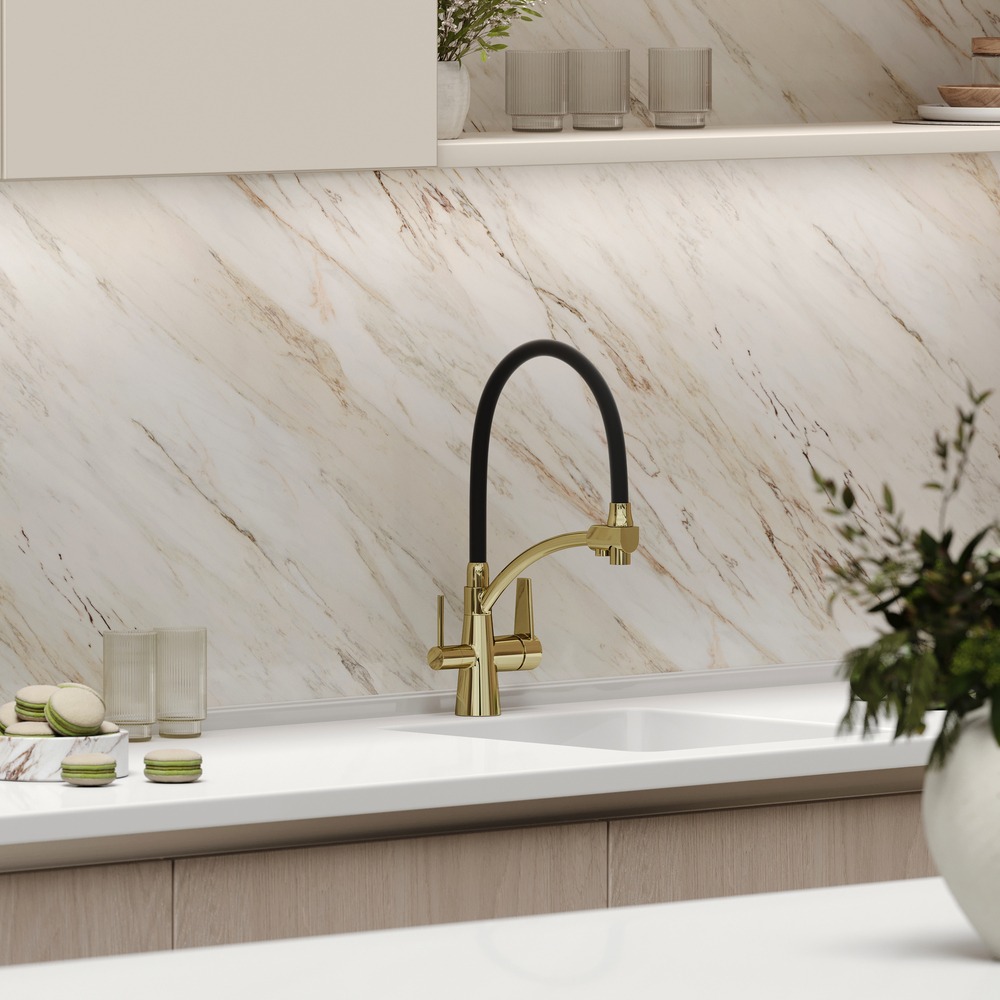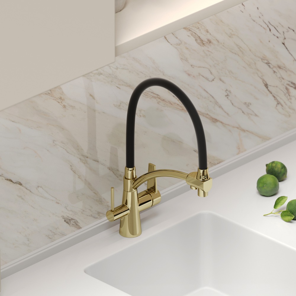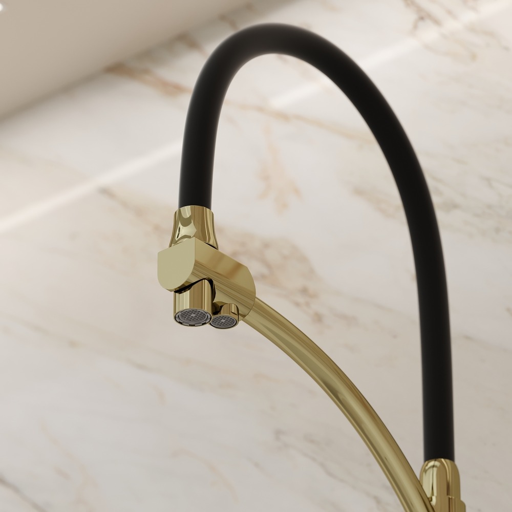 Смеситель для кухни Sancos Eri SC4001ZG с гибким, поворотным изливом и подключением фильтра питьевой воды , материал - латунь, цвет - полированное золото/чёрный.