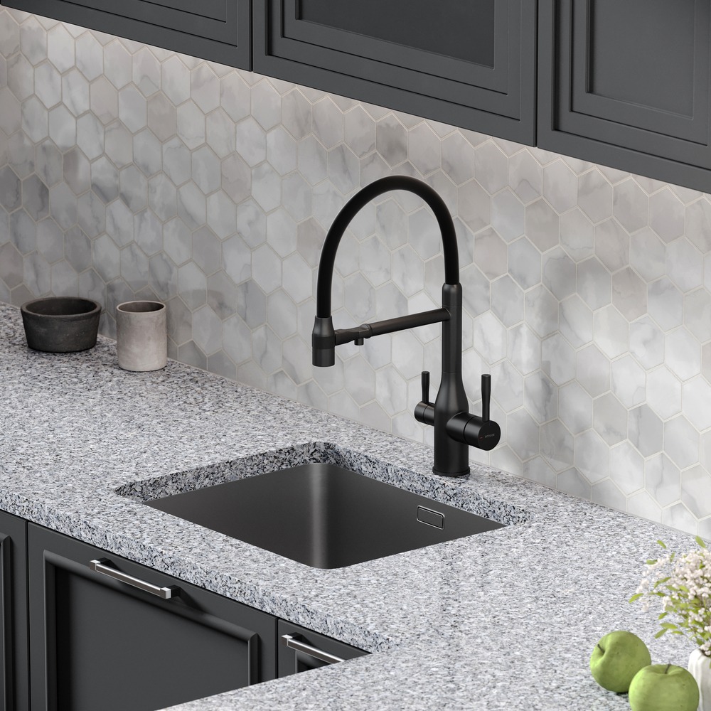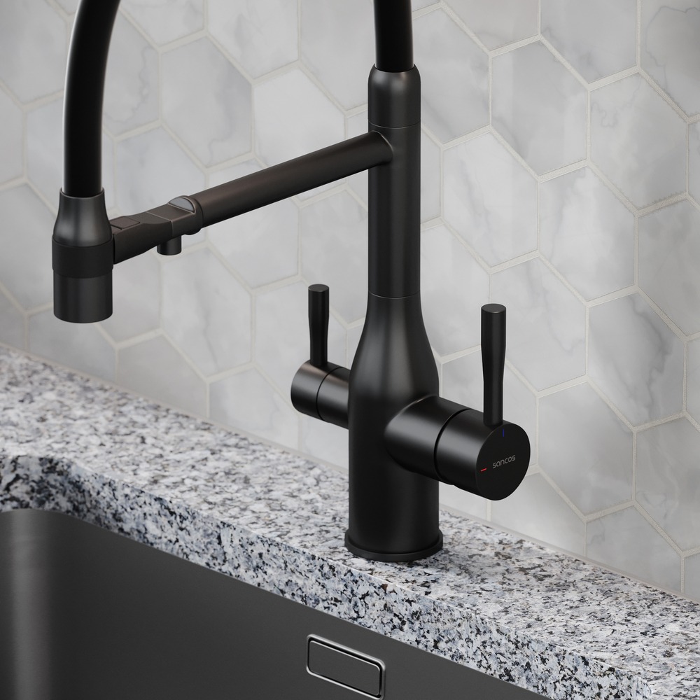 Смеситель для кухни Sancos Garda SC4009MB с гибким, поворотным изливом и подключением фильтра питьевой воды, материал - латунь, цвет - чёрный матовый/чёрный.