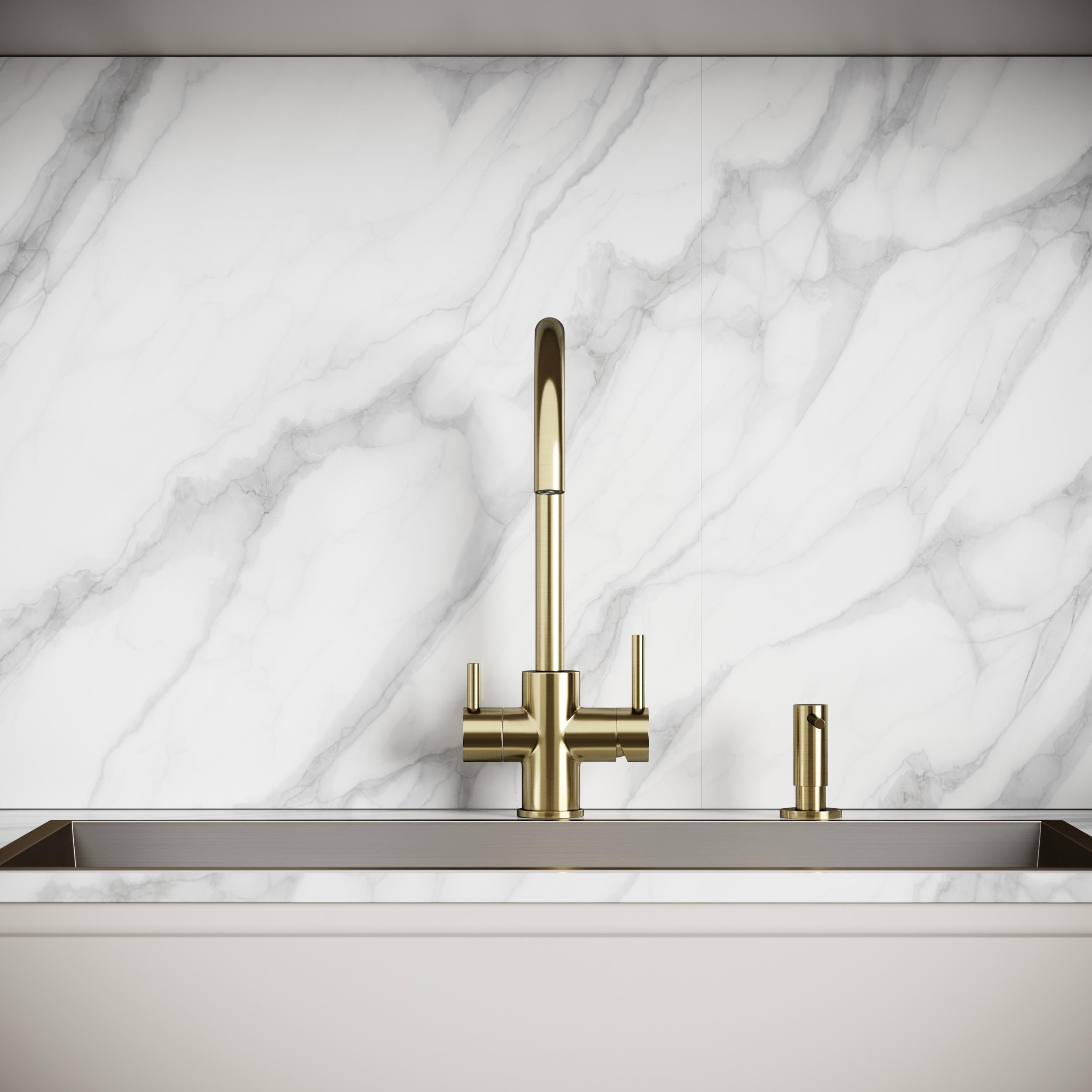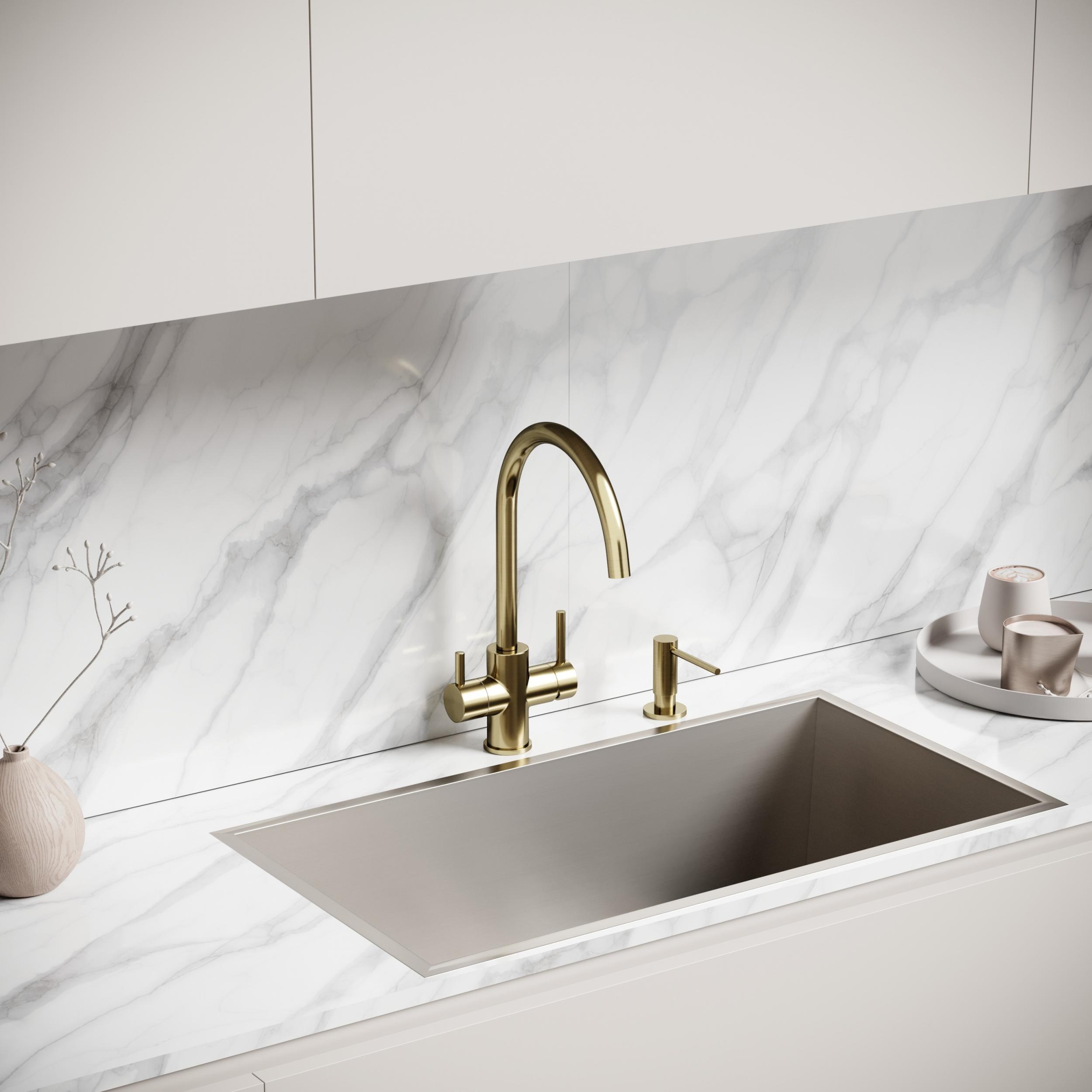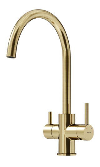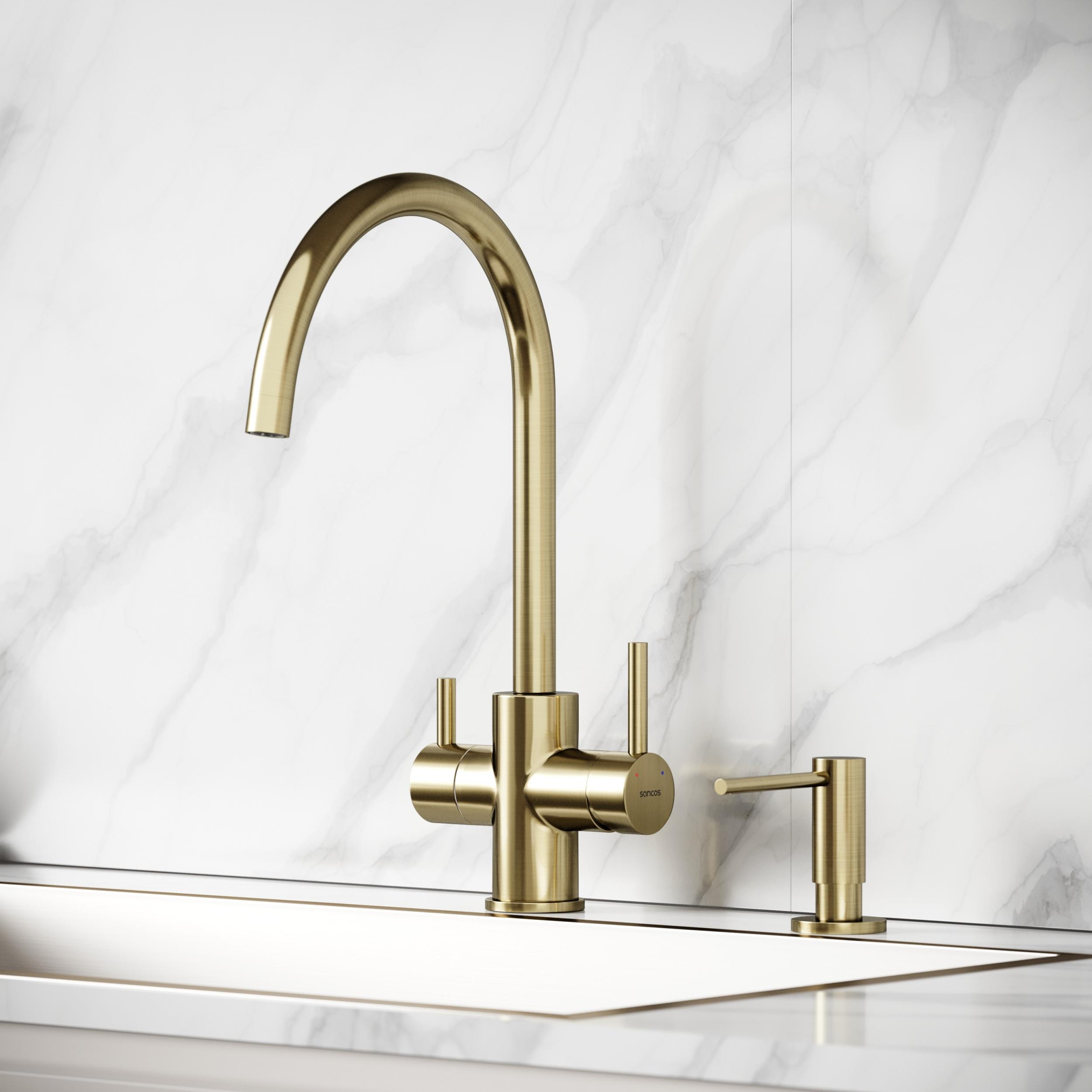 Смеситель для кухни Sancos Taper SC4012BG с поворотным изливом и подключением фильтра питьевой воды, материал - латунь, цвет - брашированное золото.
