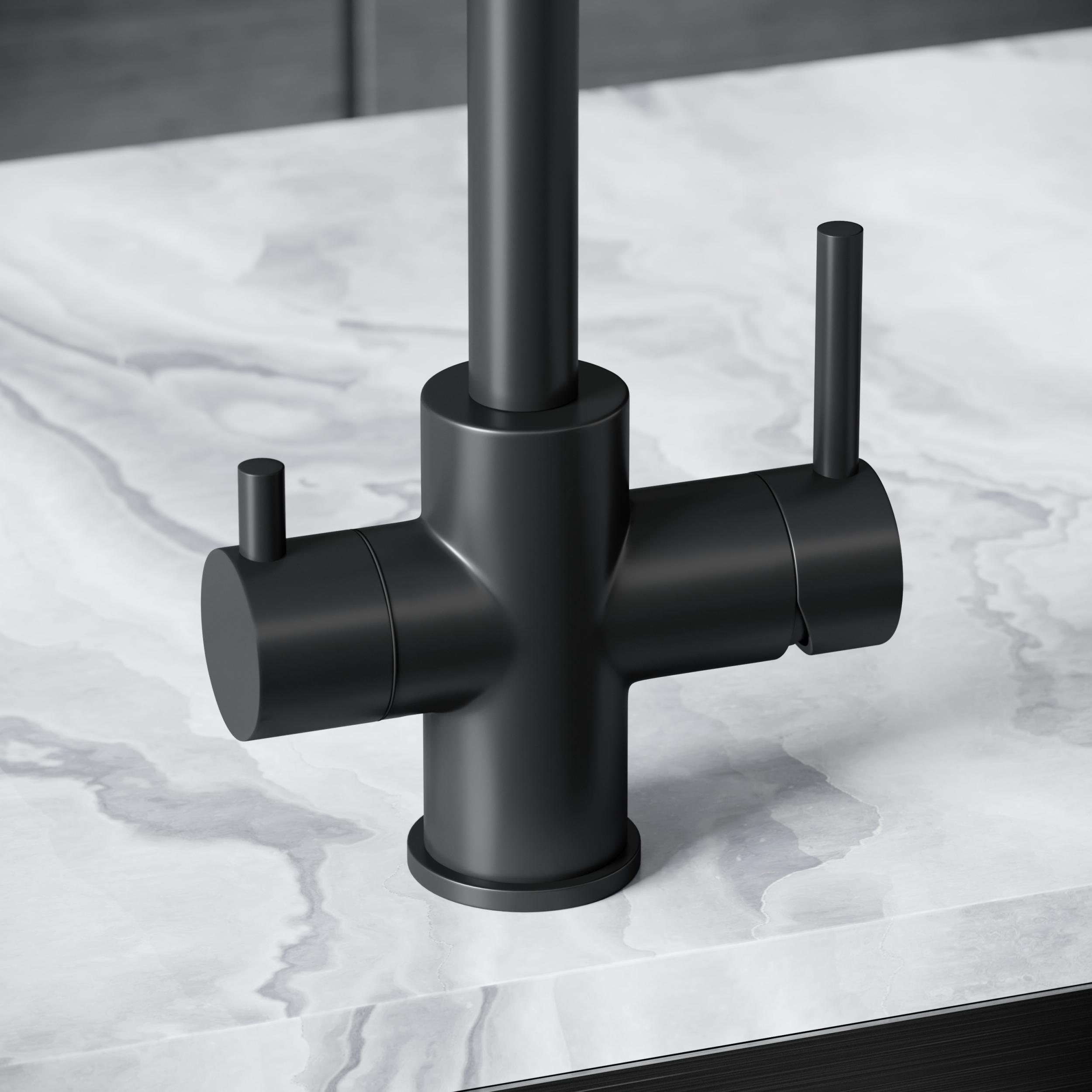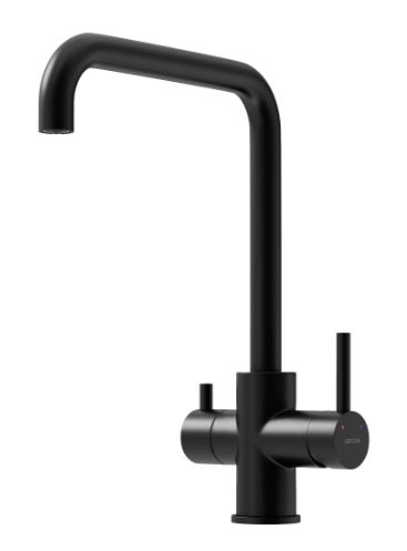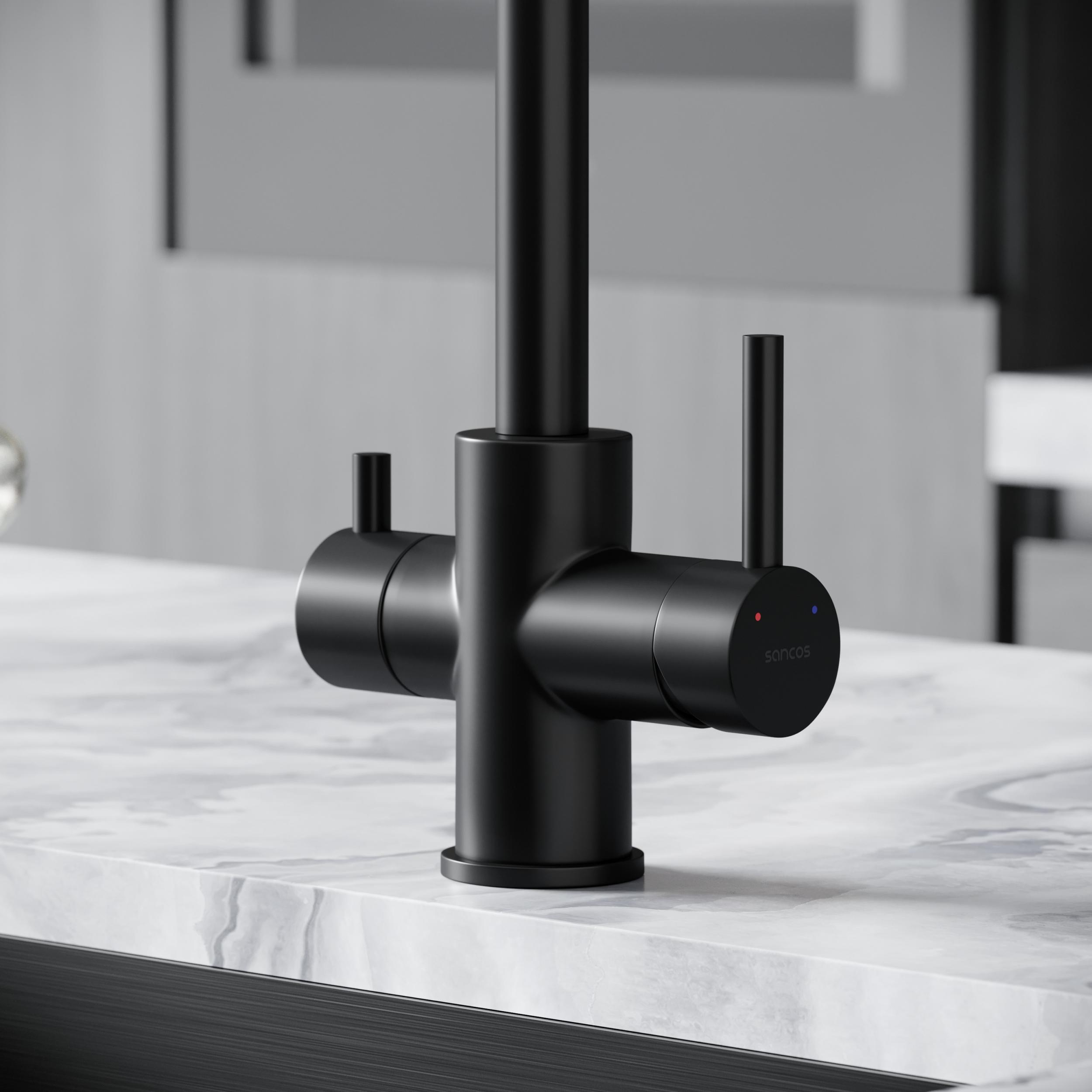Смеситель для кухни Sancos Vela SC4013MB с поворотным изливом и подключением фильтра питьевой воды, материал - латунь, цвет - чёрный матовый.