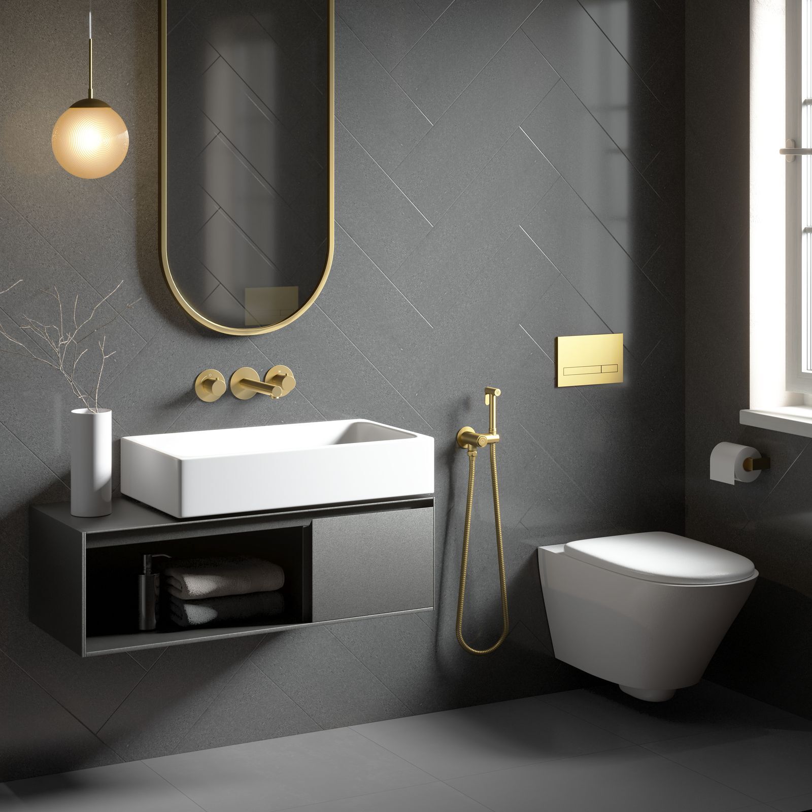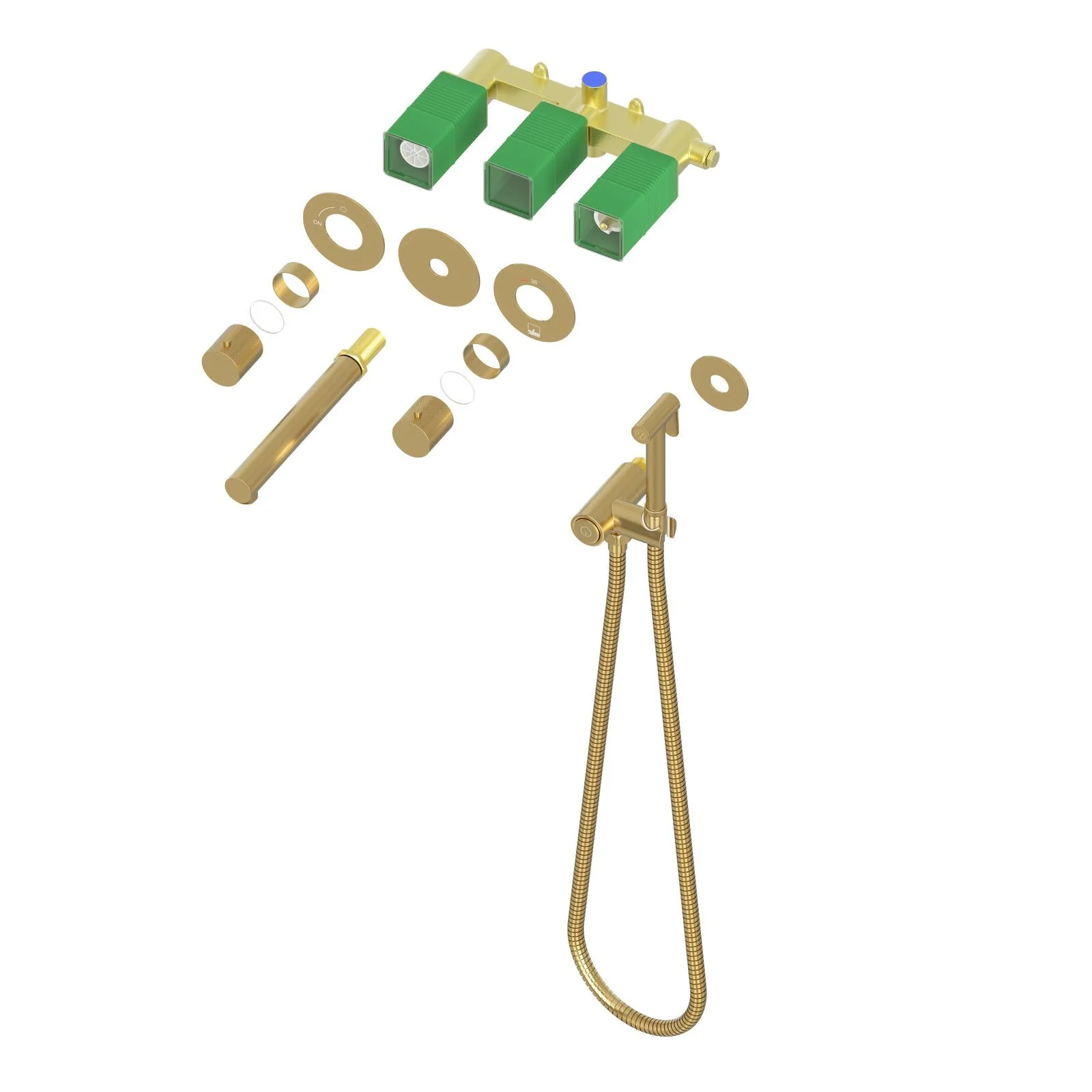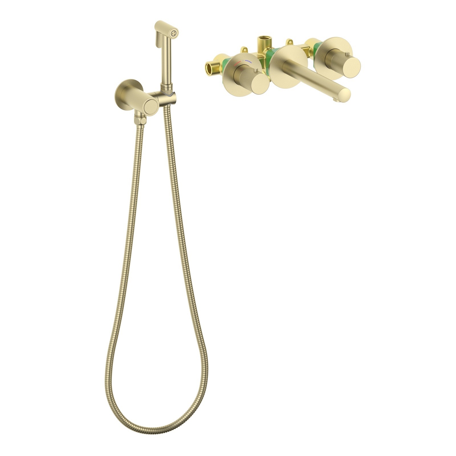 Смеситель для раковины настенный с термостатом и с гигиеническим душем Timo Saona 2383/17SM (со скрытой частью) золото матовое