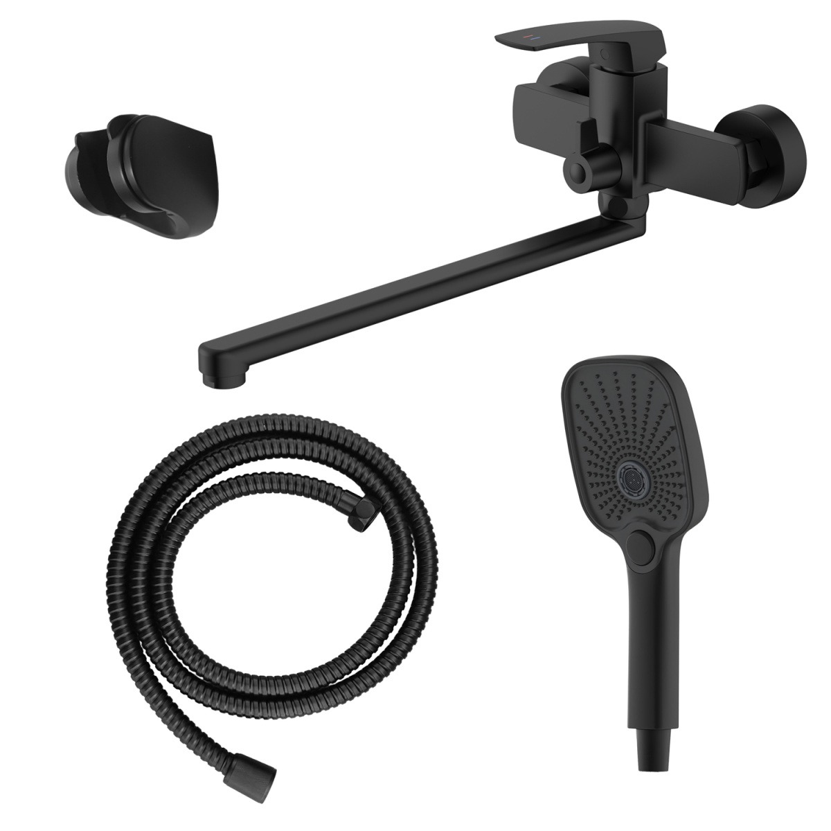 Смеситель для ванны Azario Conda AZ-K1711B с душевым гарнитуром и длинным изливом, материал латунь, цвет чёрный матовый.