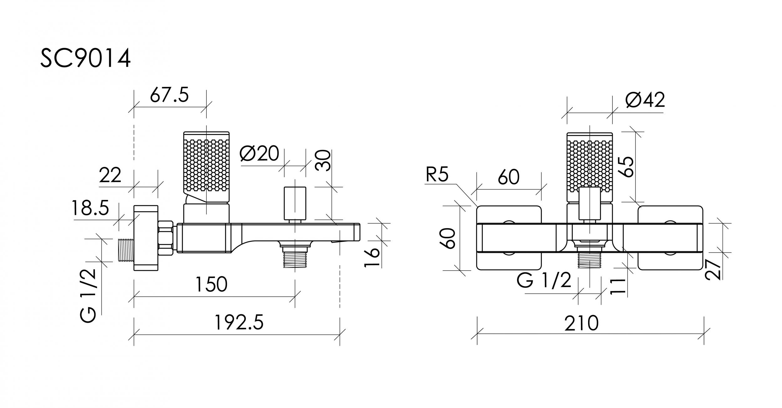 • Смеситель для ванны и душа с рифленой ручкой управления