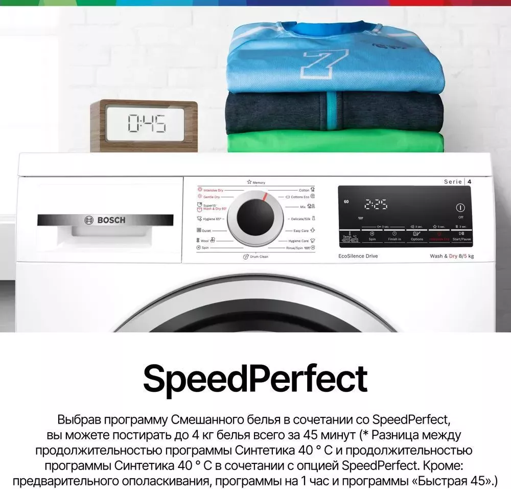 Стиральная машина Bosch WDS28460ME - это высококачественная бытовая техника относится к серии Serie 4, представляющей собой отдельностоящую модель с фронтальной загрузкой. Максимальная загрузка при стирке составляет 8 кг, что делает ее идеальной для больших семей, а при сушке - 5 кг. Машина обладает максимальной скоростью отжима 1400 об./мин., что обеспечивает эффективное удаление влаги из одежды. Управление осуществляется электронным способом с помощью поворотного переключателя и сенсорных кнопок, а информация отображается на многофункциональном LED-дисплее. В нем отображается информация о ходе программы и времени до окончания стирки, а также сигнализируется о ее окончании акустическим сигналом.
