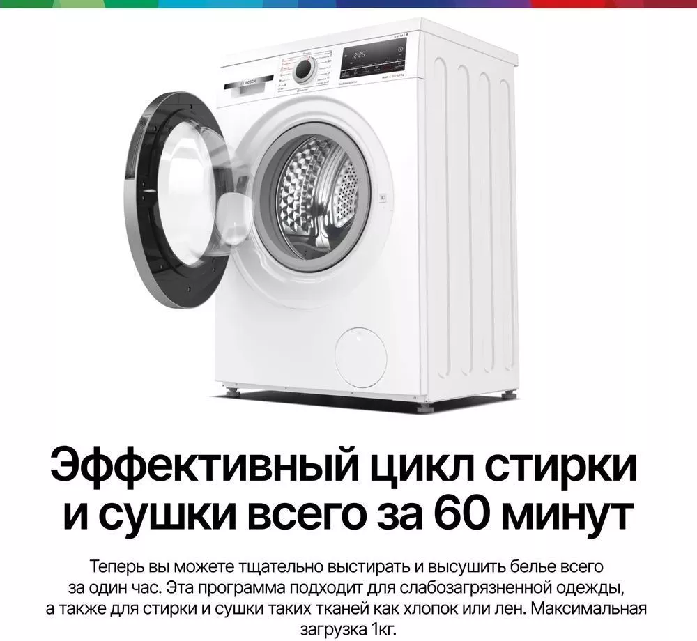 - Дополнительные функциональные опции: Пуховики, Очистка барабана с напоминанием, Быстрая 15', HygieneCare, Смешанная загрузка, Отжим/слив, Полоскание/отжим, Дополнительное полоскание, SpeedPerfect, Предварительная стирка, Стирка и сушка 60 мин, Программы по времени