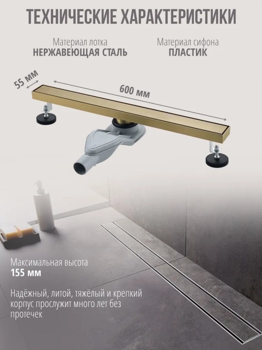 Трап Grocenberg 60 см T600MG, матовое золото (под плитку)