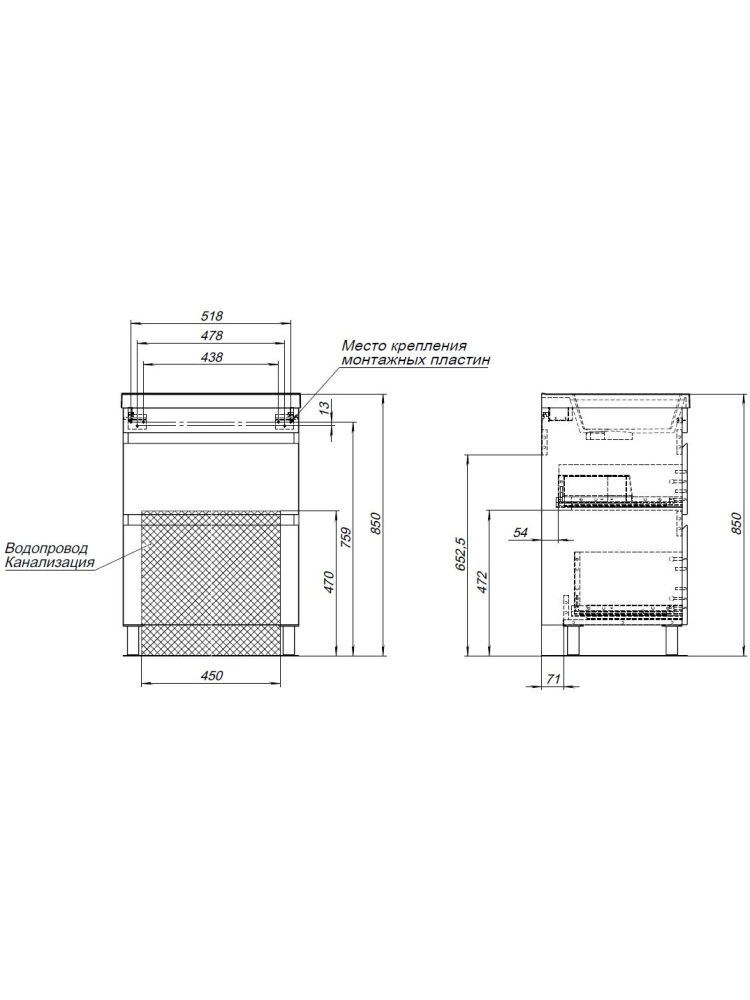 - Место для подводки коммуникаций снизу за нижним ящиком, что упрощает монтаж и обслуживание.
