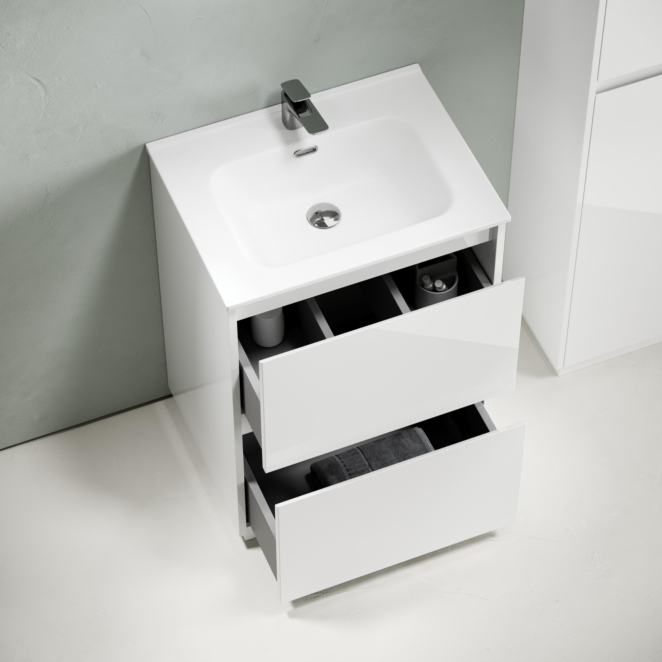 Тумба напольная Libra c двумя ящиками с доводчиками скрытого монтажа, с системой плавного закрывания и с ручкой по всей длине ящика. Каркас и фасад тумбы выполнен из ЛДСП, покрытие эмаль, цвет белый глянец. Основание тумбы имеет ножки c регулировкой высоты до 10 мм для компенсации возможной неровности напольного покрытия. Внутреннее пространство тумбы выполнено из надежного ЛДСП серого цвета.