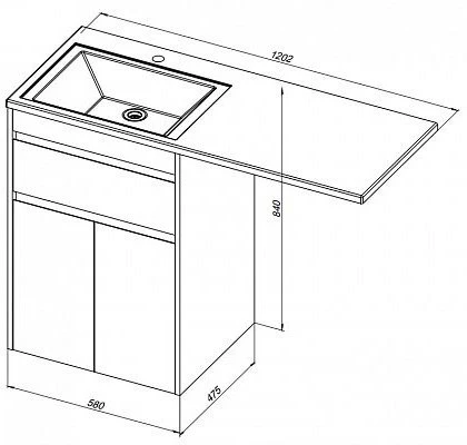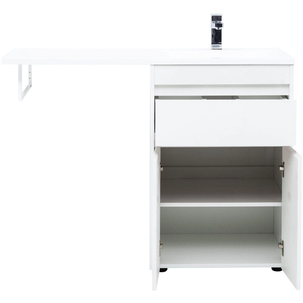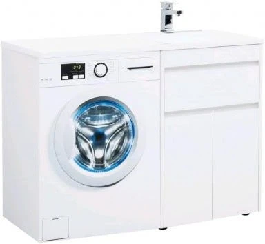 - Раковина из литьевого мрамора имеет длинную платформу, которая выходит далеко за пределы тумбы. Она предназначена для того, чтобы установить с другой стороны от тумбы стиральную машину. Платформа имеет такую длину, которая позволит спрятать под нее машинку средних размеров с фронтальной загрузкой.