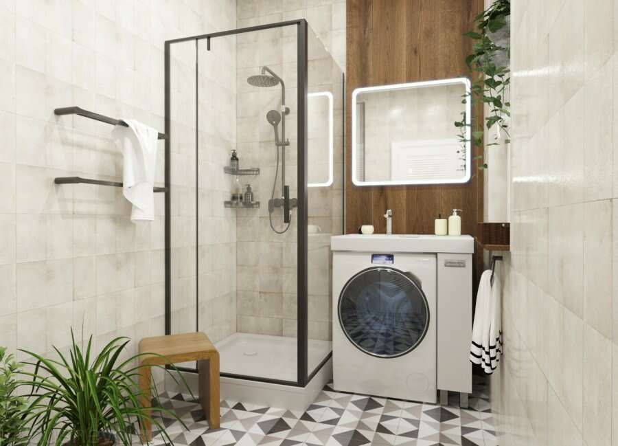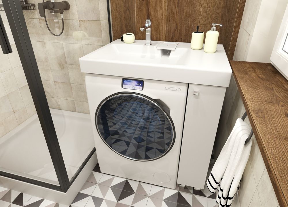 Простые и четкие линии тумбы идеально впишутся в интерьер в стиле «минимализм», а компактная раковина из литьевого мрамора установленная над стиральной машиной, позволяет сэкономить место в ванной комнате.