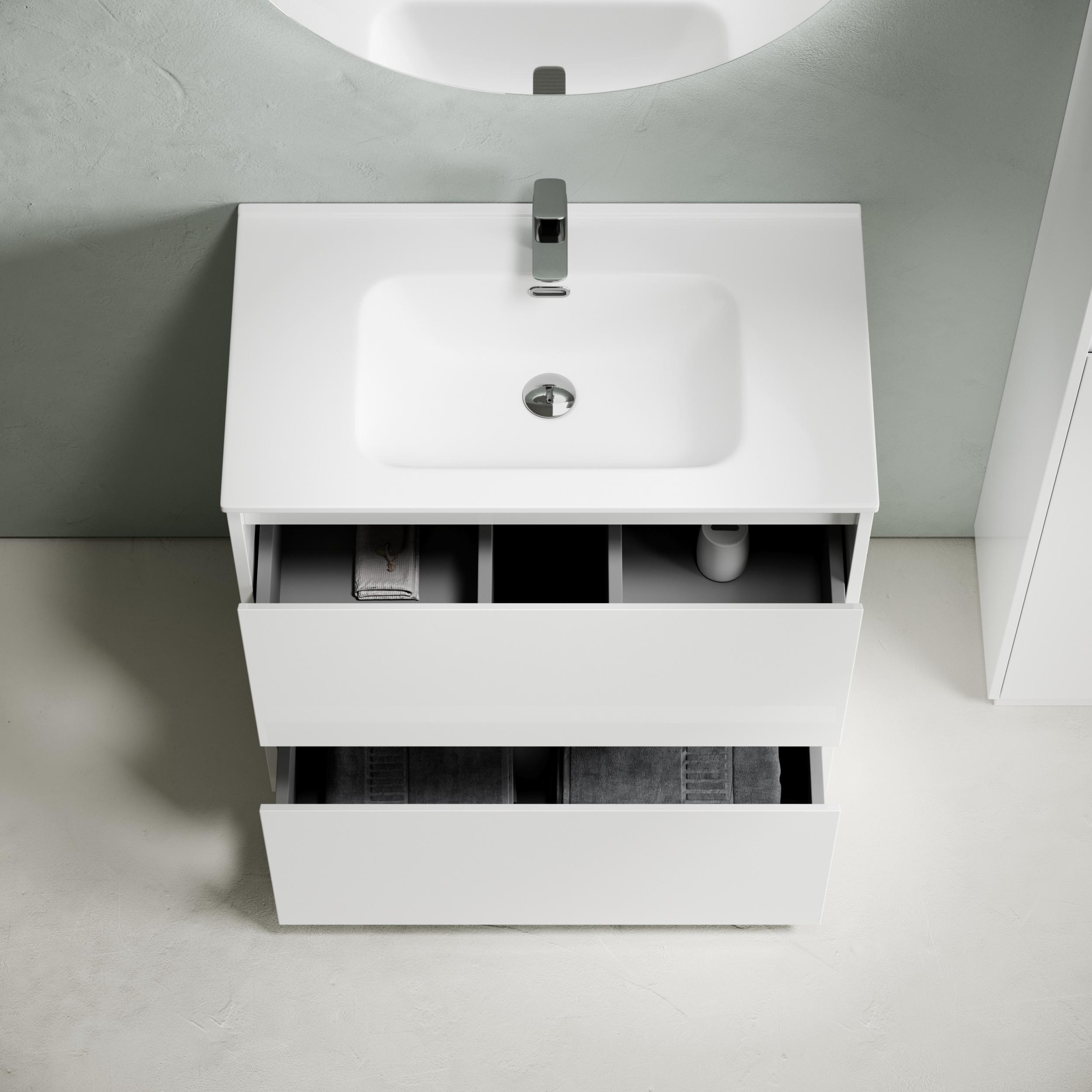 Тумба напольная Libra c двумя ящиками с доводчиками скрытого монтажа, с системой плавного закрывания и с ручкой по всей длине ящика. Каркас и фасад тумбы выполнен из ЛДСП, покрытие эмаль, цвет белый глянец. Основание тумбы имеет ножки c регулировкой высоты до 10 мм для компенсации возможной неровности напольного покрытия. Внутреннее пространство тумбы выполнено из надежного ЛДСП серого цвета.