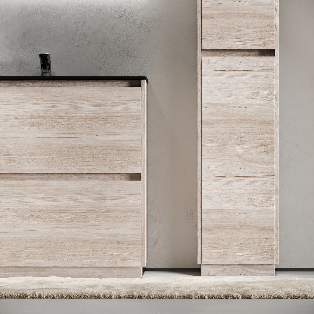 Тумба напольная Libra c двумя ящиками с доводчиками скрытого монтажа, с системой плавного закрывания и с ручкой по всей длине ящика. Каркас и фасад тумбы выполнен из ЛДСП в цвете «дуб галифакс натуральный». Покрытие - ламинат. Основание тумбы имеет ножки c регулировкой высоты до10 мм для компенсации возможной неровности напольного покрытия. Внутреннее пространство тумбы выполнено из надежного ЛДСП серого цвета.