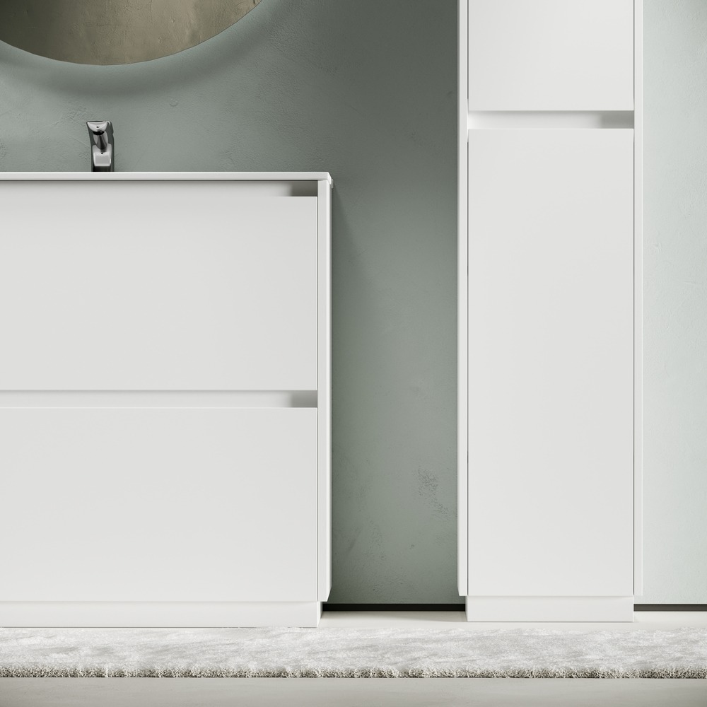 Тумба напольная Libra c двумя ящиками с доводчиками скрытого монтажа, с системой плавного закрывания и с ручкой по всей длине ящика. Каркас и фасад тумбы выполнен из ЛДСП, покрытие эмаль, цвет белый глянец. Основание тумбы имеет ножки c регулировкой высоты до 10 мм для компенсации возможной неровности напольного покрытия. Внутреннее пространство тумбы выполнено из надежного ЛДСП серого цвета.