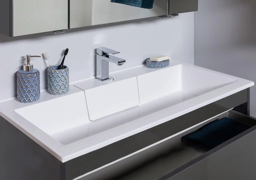 - Тумба комплектуется раковиной из литьевого мрамора «Фортуна», которая имеет уникальную конструкцию слива: вместо привычного расположения по центру, он находится в скрытом отсеке под съемной крышкой. Смещение слива и сифона к стене, в сторону канализационного отвода, избавляет от необходимости менять устройство верхнего ящика тумбы и делать в нем выемку. Теперь он свободно передвигается под раковиной и имеет большую вместимость.