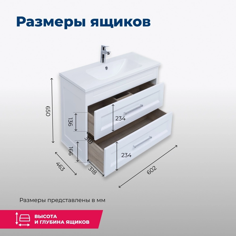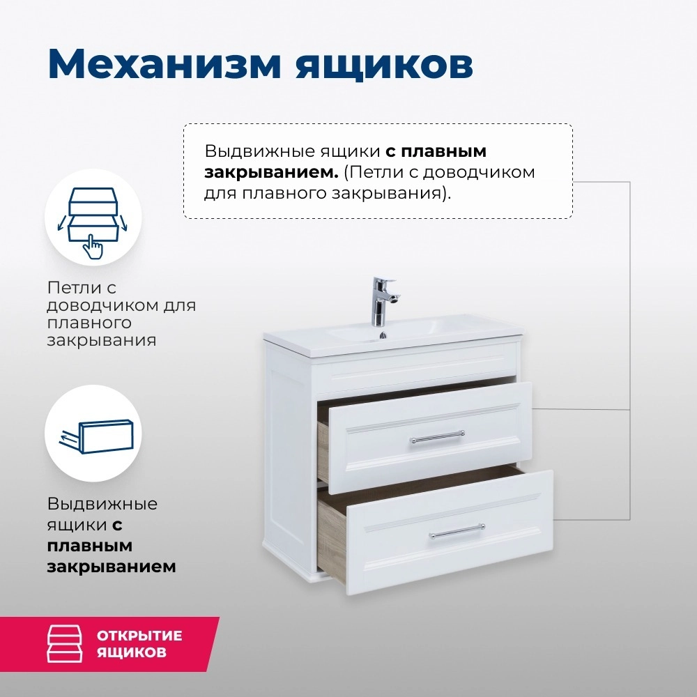 - Тумба с двумя выдвижными ящиками, оборудованными доводчиками, вмещает огромное количество полезных вещей.