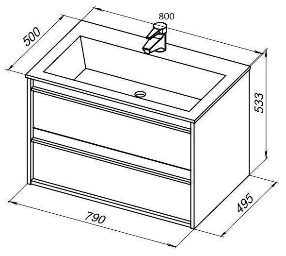 - Корпус и фасады тумбы шириной 80 см – из влагостойкого ЛДСП, внутренняя часть ящиков выполнена в цвете «дуб кантри», что создает легкий контраст белоснежным деталям корпуса и фасада.