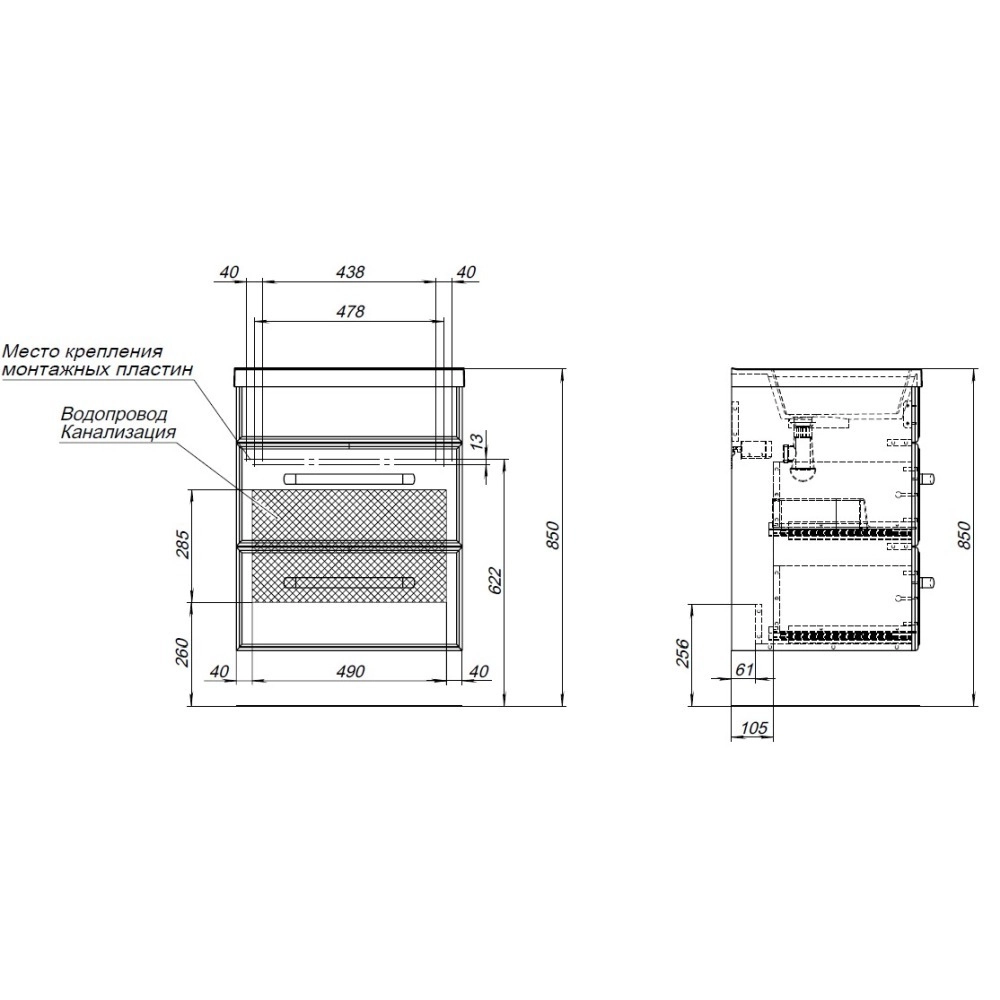 - В тумбах за нижним ящиком предусмотрено место для подводки коммуникаций.