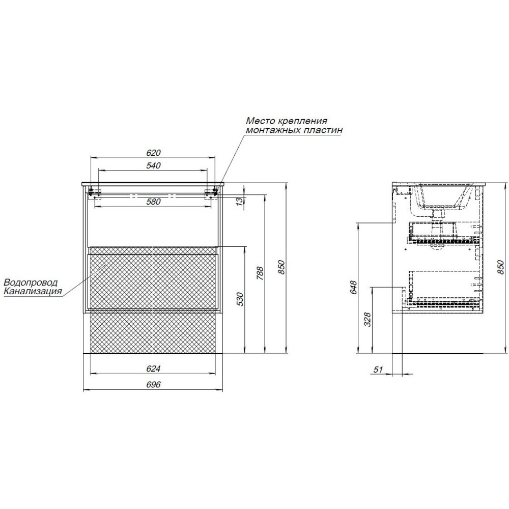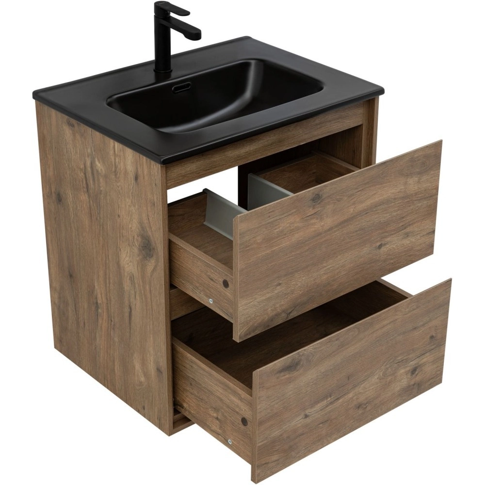Кроме того, надёжные навесы, способные выдерживать нагрузки до 130 кг, обеспечивают уверенную поддержку раковины и всего оборудования. Внутреннее пространство тумбы организовано с умом: выдвижные ящики из ВЛДСП имеют прочное дно и направляющие частичного выдвижения, что делает их идеальными для хранения туалетных принадлежностей. Специальная пластиковая вставка под сифон в сером цвете завершает функционал тумбы, сохраняя при этом чистоту и порядок в ванной комнате.