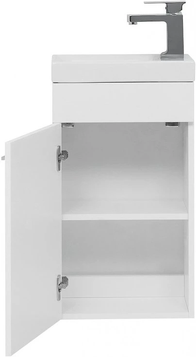 - Тумба под раковину Aquanet «Нота» 40 L (Moduo) — компактная модель белого цвета с левосторонней ориентацией, которая подойдет для обустройства небольшой ванной комнаты или санузла.