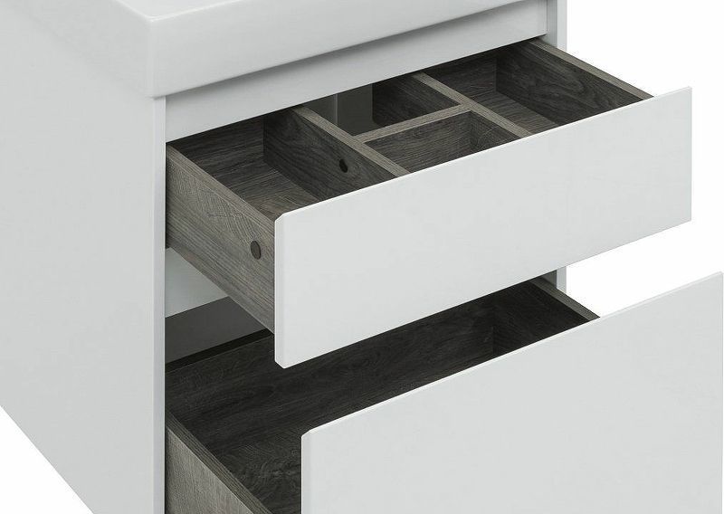 Тумба с раковиной Aquanet Nova Lite 60 белоснежного цвета из влагостойкой ламинированной древесно-стружечной плиты выглядит нарядно. Подвесной монтаж придает визуальную легкость тумбе шириной 60 см. Она оборудована двумя выдвижными ящиками. Ящики довольно вместительные и позволяют разместить все необходимое. Комплектуются направляющими немецкого производства Hettich Quadro, оснащенными доводчиками. Фасады выполнены с декоративной интегрированной ручкой, не имеющей острых краев и внутренних углов, что обеспечивает удобство эксплуатации и легкий уход за мебелью. Неглубокая и стильная керамическая раковина «Латина» идеально подходит к тумбе.