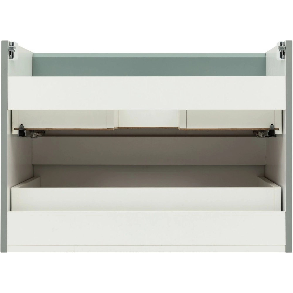 - Тумба оснащена двумя ящиками с механизмом доводчика, что обеспечивает плавное и бесшумное закрытие, а также высокую функциональность.