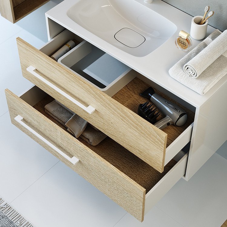 - Тумба оборудована двумя ящиками с системой мягкого закрывания австрийской фирмы «Blum».