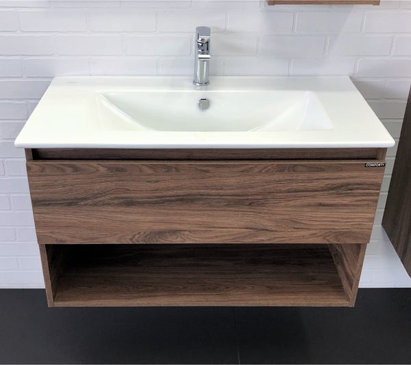 Тумба подвесная Comforty Бордо 90 см с раковиной Quadro 90, цвет дуб тёмно-коричневый.