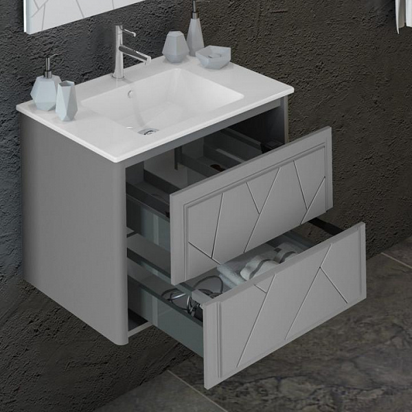 Тумба подвесная Opadiris Луиджи 70 см с раковиной Cerastyle Ibiza 70, цвет серый матовый. Ящики с механизмами плавного закрывания Hettich (Германия).