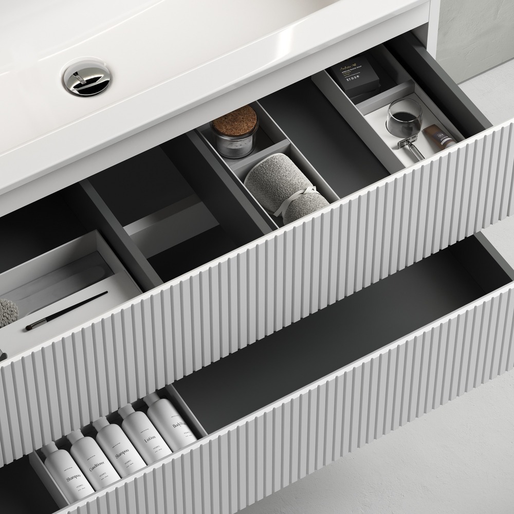 - Тумба подвесная Snob T c двумя ящиками оснащенными доводчиками скрытого монтажа с системой плавного закрывания. Каркас и фасад тумбы выполнен из МДФ, покрытие пвх - плёнка в цвете «Bianco».Размер 995х445х500.
