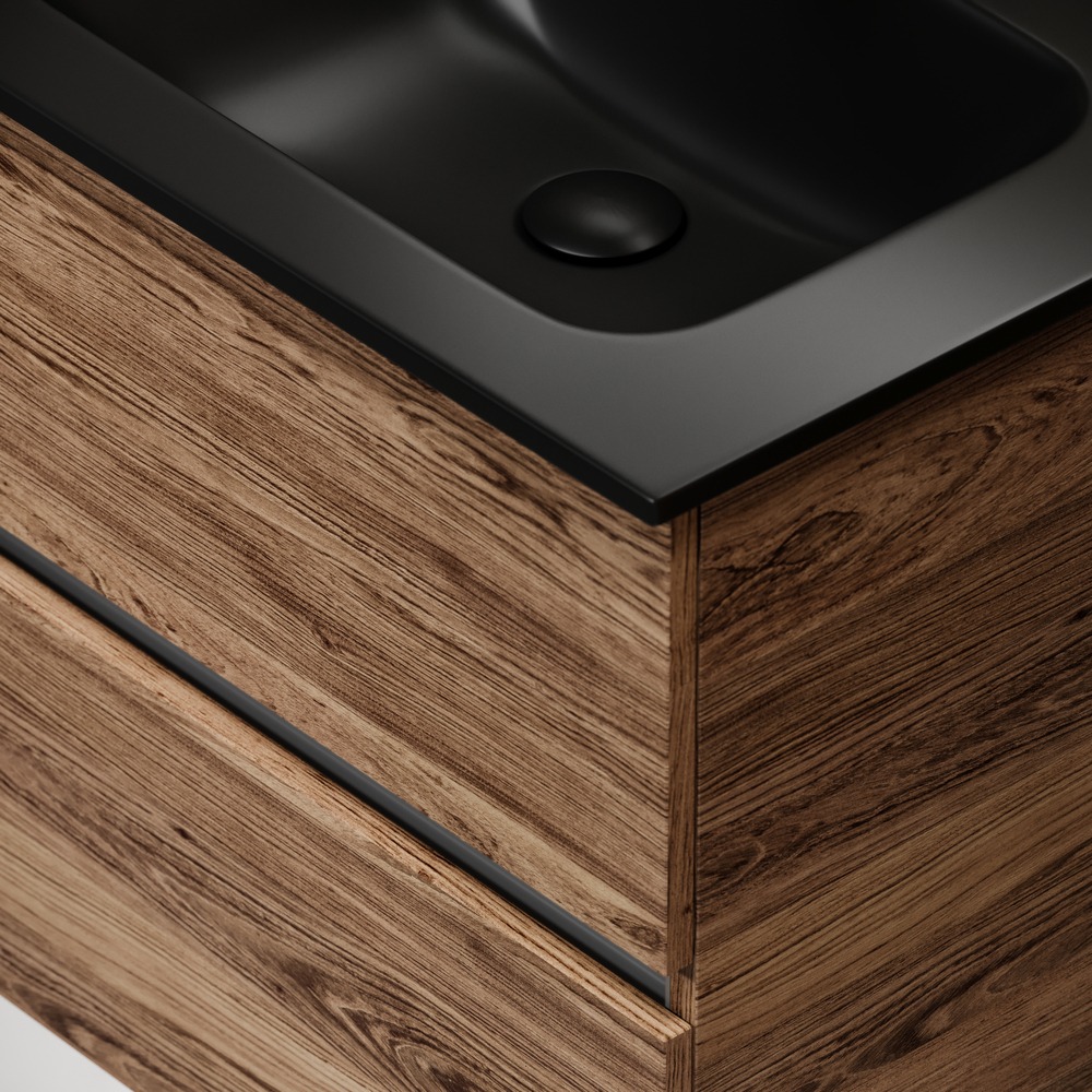 - Тумба подвесная Urban c двумя ящиками оснащенными доводчиками скрытого монтажа с системой плавного закрывания, а также с ручкой Gola по всей длине тумбы. Каркас тумбы и фасад выполнен из ЛДСП в цвете «дуб чарльстон».