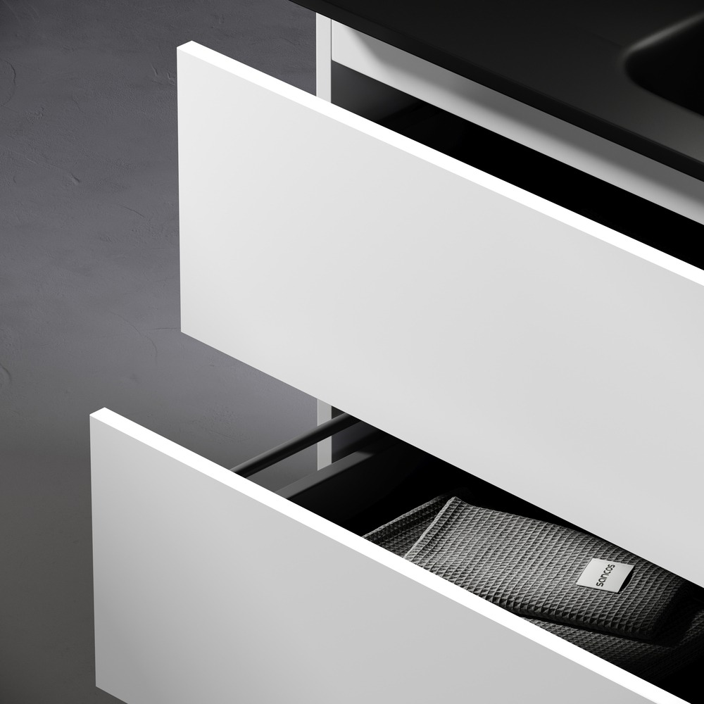 - Тумба подвесная Urban c двумя ящиками оснащенными доводчиками скрытого монтажа с системой плавного закрывания, а также с ручкой Gola по всей длине тумбы. Корпус тумбы выполнен из ЛДСП, фасад – из МДФ с покрытием "эмаль" в цвете «белый глянец».