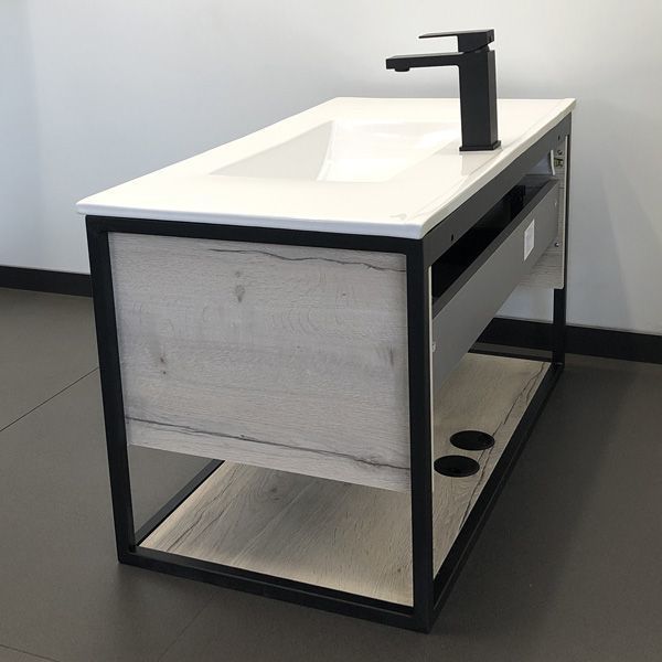 Подвесная тумба-умывальник с одним выкатным ящиком оснащенным системой плавного закрывания и нижней полкой открытого хранения. В основе тумбы - каркас из стального профиля окрашенный черной матовой эмалью. Профильная ручка из черного металла. Керамическая раковина Sanita Luxe Quadro 90 из санфарфора. Тумба подготовлена для подключения водоснабжения снизу.