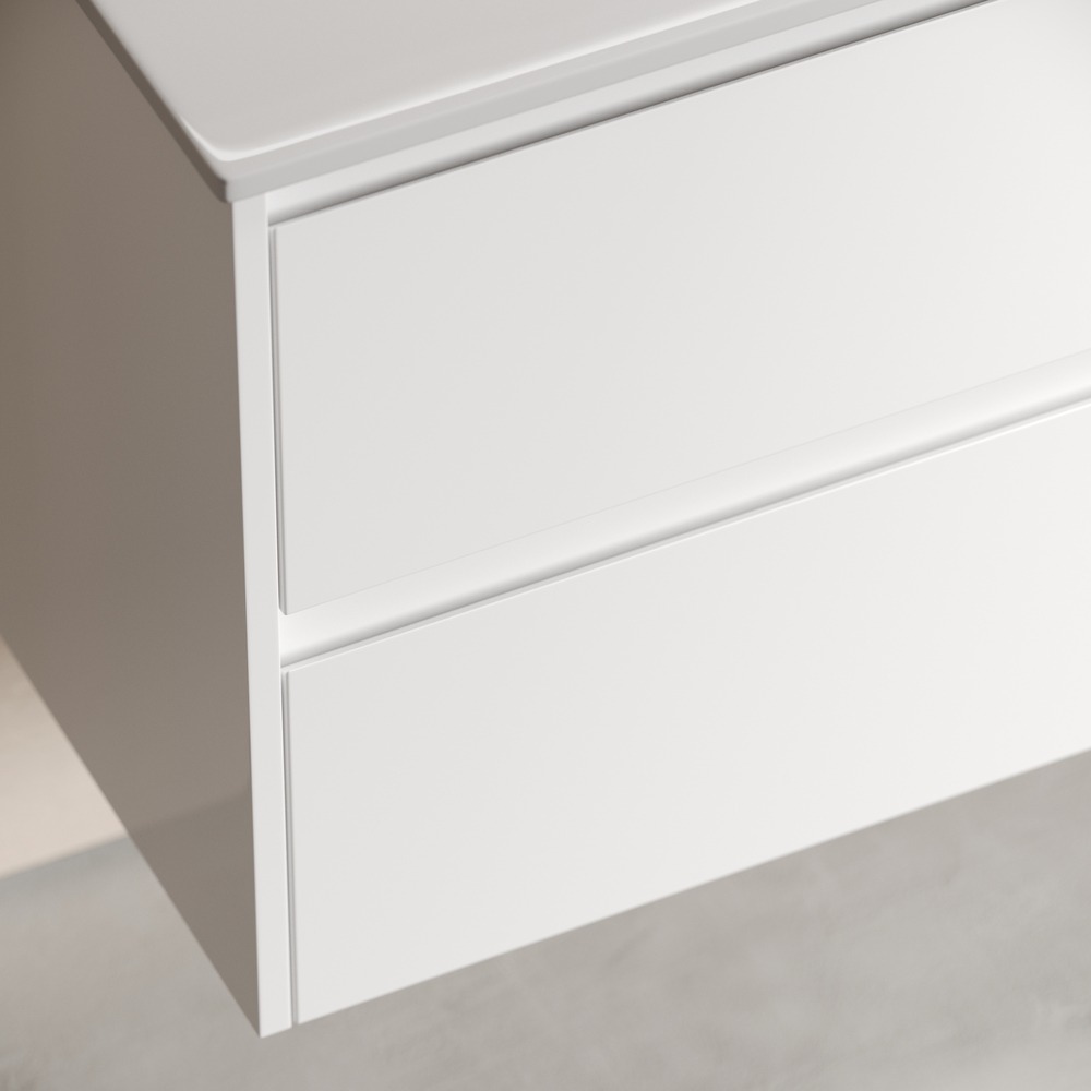 - Тумба подвесная Libra c двумя ящиками оснащенными доводчиками скрытого монтажа с системой плавного закрывания и с ручкой по всей длине ящика. Каркас и фасад тумбы выполнен из МДФ в цвете «белый глянец».