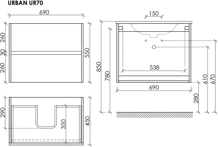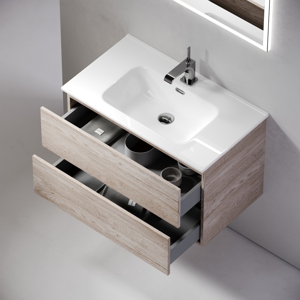 • Тумба подвесная Urban c двумя ящиками оснащенными доводчиками скрытого монтажа с системой плавного закрывания, а также с ручкой Gola по всей длине тумбы. Каркас тумбы и фасад выполнен из ЛДСП в цвете «дуб галифакс натуральный».
