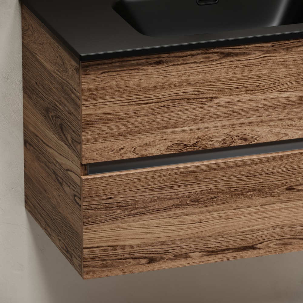 - Тумба подвесная Urban c двумя ящиками оснащенными доводчиками скрытого монтажа с системой плавного закрывания, а также с ручкой Gola по всей длине тумбы. Каркас тумбы и фасад выполнен из ЛДСП в цвете «дуб чарльстон».