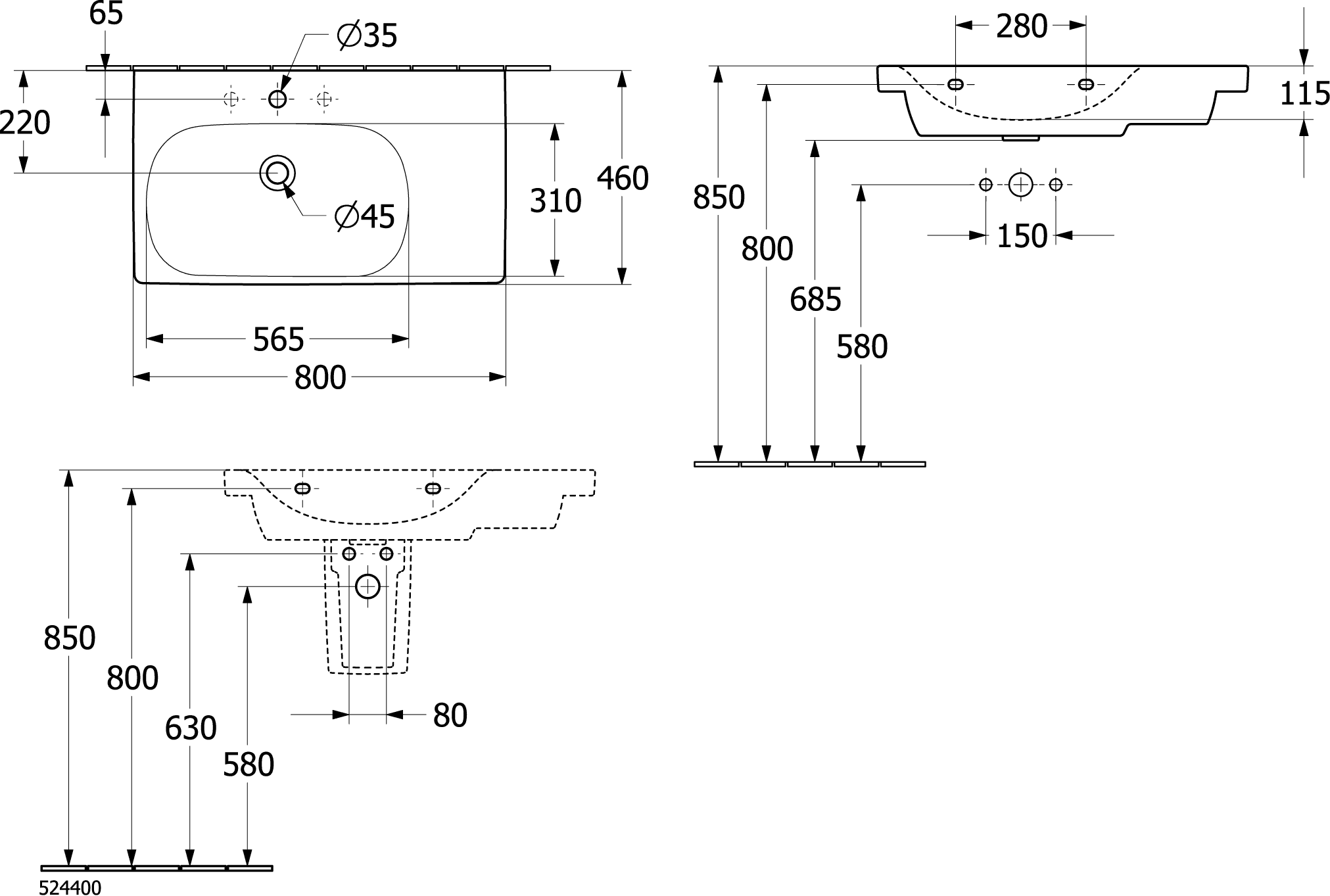 - Габариты раковины - 800 x 460 x 160 мм (длина x ширина x высота).