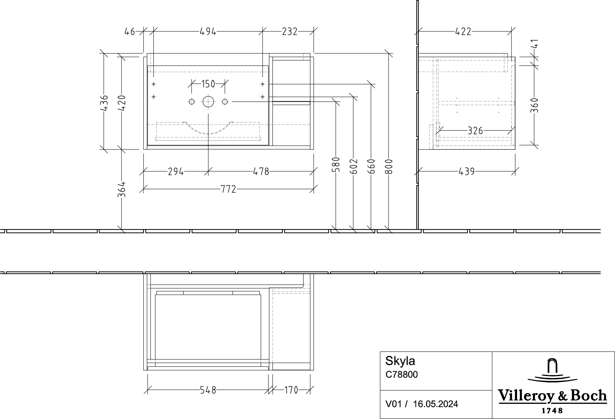 Тумба подвесная с раковиной-столешницей Villeroy&Boch Skyla 80 см C78800VE (раковина 5A52L101)