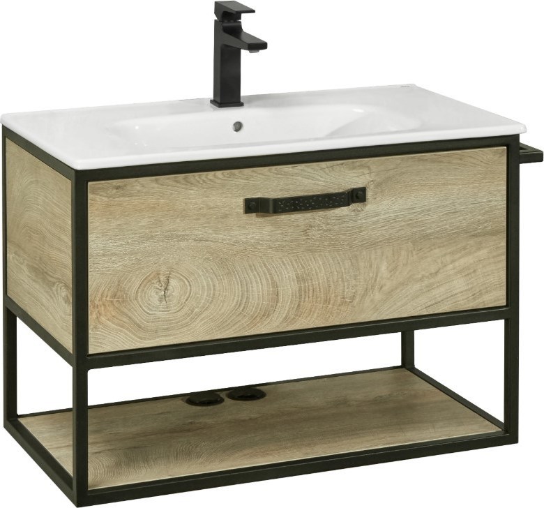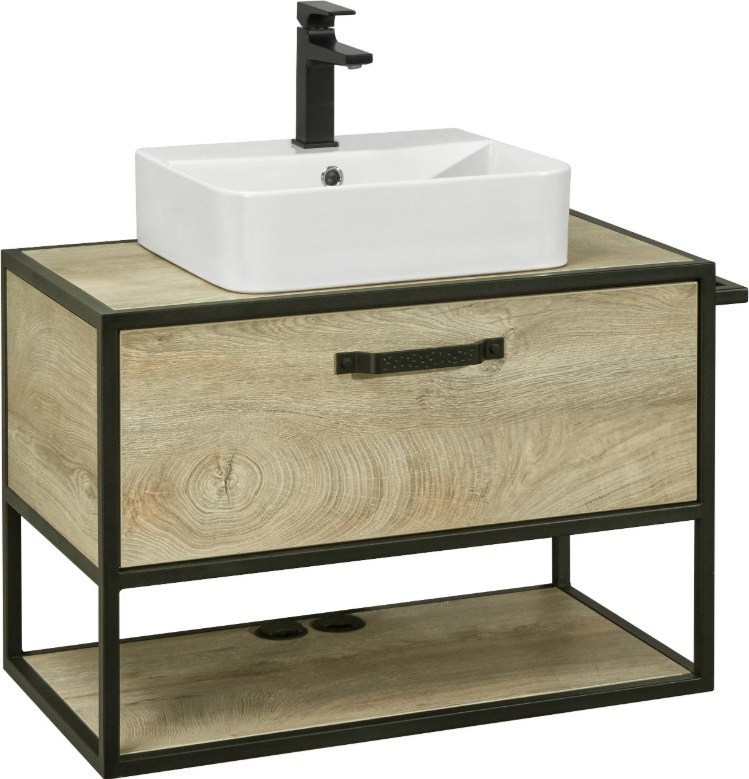 Тумба подвесная со столешницей Акватон Лофт Фабрик 80 см 1A242401LTDU0, цвет мебели - дуб эндгрейн, цвет фурнитуры - черный. Раковина приобретается отдельно.