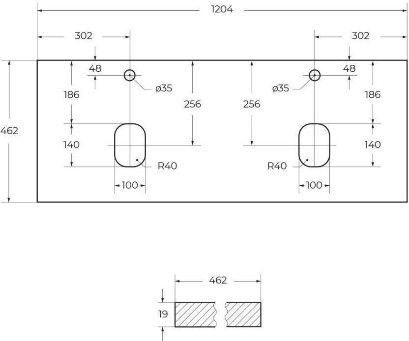 - Столешница из МДФ EK-120-2-BO с двумя отверстиями под раковину и с двумя отверстиями под смеситель, цвет - Bianco Opaco