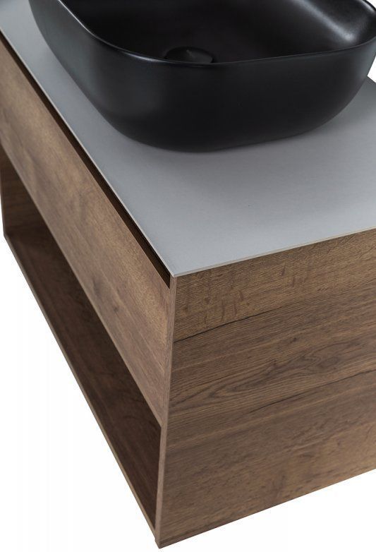 - Система хранения: 1 выдвижной ящик с врезной (фрезерованной) ручкой в плоскости фасада и открытая полка