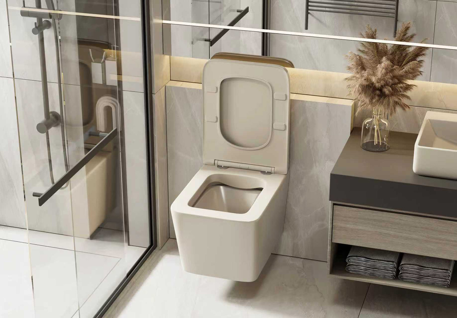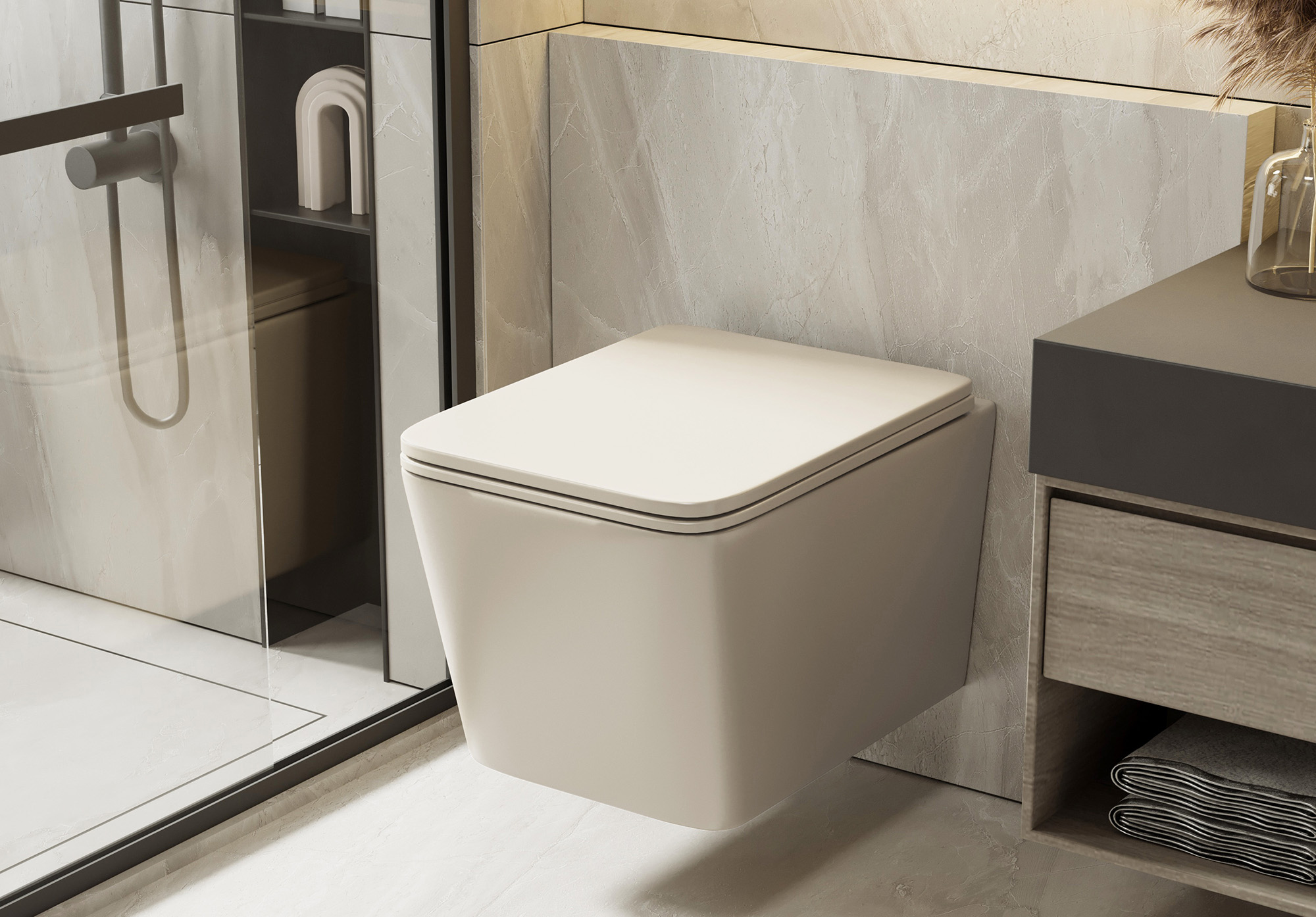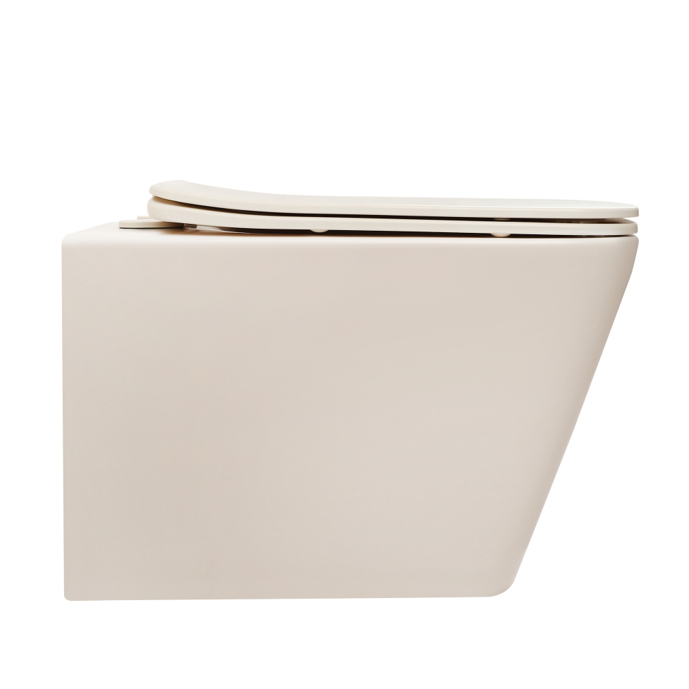 Унитаз подвесной безободковый Abber Rechteck AC1201MBE с тонкой крышкой микролифт, светло-бежевый матовый