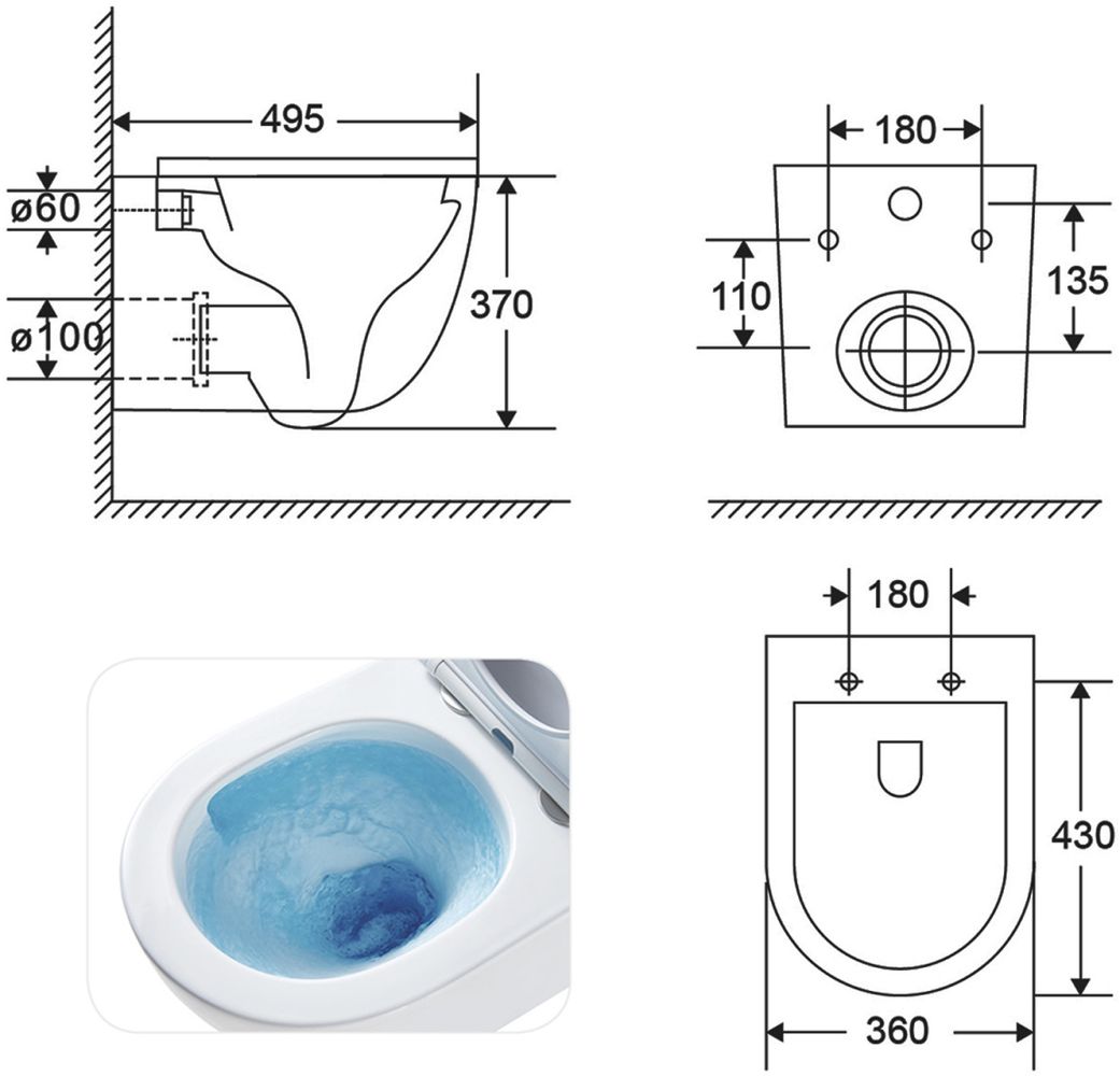 - Габариты 495x360x370 мм позволяют установить унитаз даже в небольших ванных комнатах, экономя пространство.
