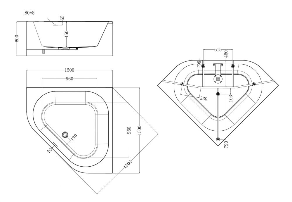 - Оптимальный размер. Габариты 150×150 см обеспечивают достаточно места для комфортного принятия ванны — даже при компактных внешних размерах внутреннее пространство максимально вместительно.