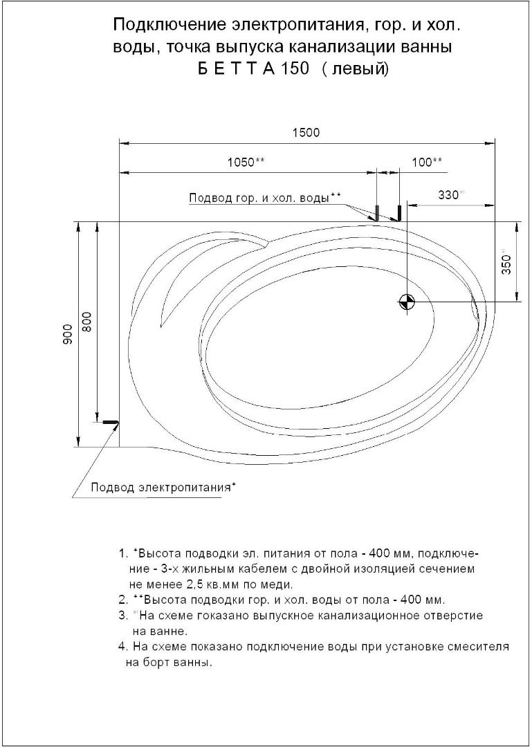 Ванна акриловая Aquatek Бетта, размер 1500x970 мм, цвет белый. Каркас, панель и сифон приобретается отдельно.