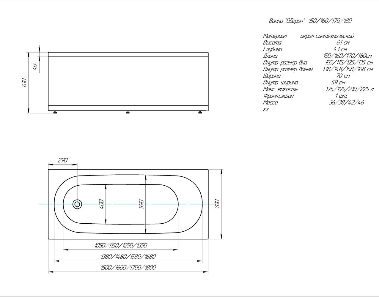 Ванна акриловая Aquatek Оберон, размер 1500x700 мм, цвет белый. Каркас, панель и сифон приобретается отдельно.