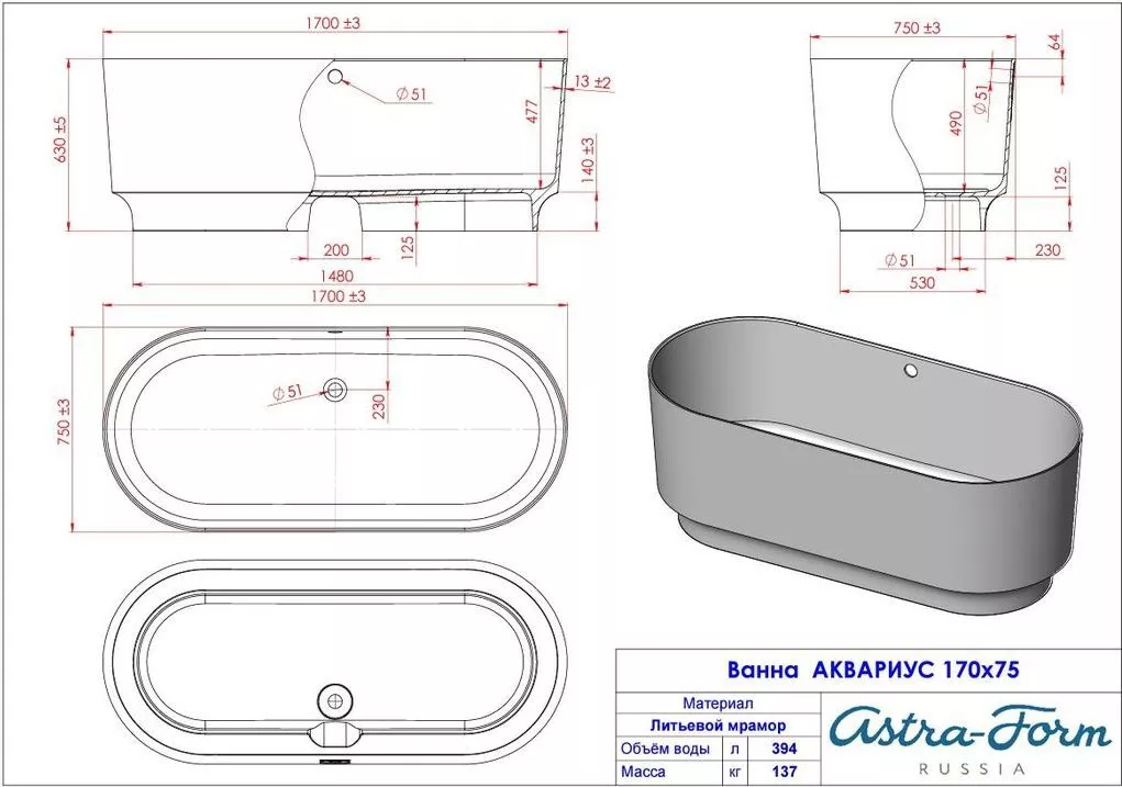 Ванна Астра-Форм Аквариус 1700х750 мм, материал литой мрамор, цвет белый.