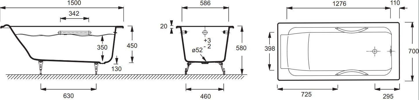 Ванна чугунная Jacob Delafon Parallel 150х70 см E2949-00. С отверстиями для ручек.