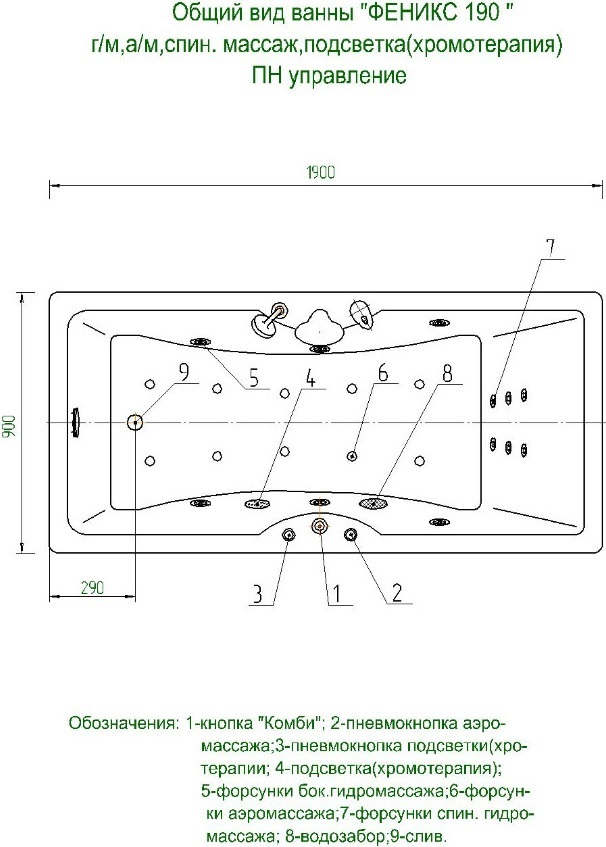 Ванна гидромассажная Aquatek Феникс 190x90 см модель 2.